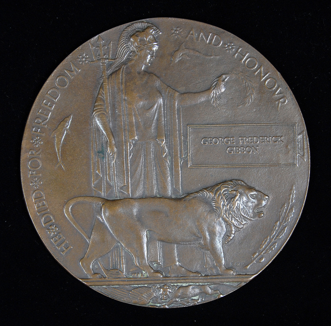 Great War Bronze Memorial Plaque (George Frederick Gibbon), good very fine, in card envelope of issue; with the recipient's Memorial Scroll, named 'Pte. George Frederick Gibbon, Royal W. Kent Regt.'; and two letters of condolence, addressed to Mrs M. Gibbon, 2 Horns Lane, Haverfordwest, Pembrokeshire