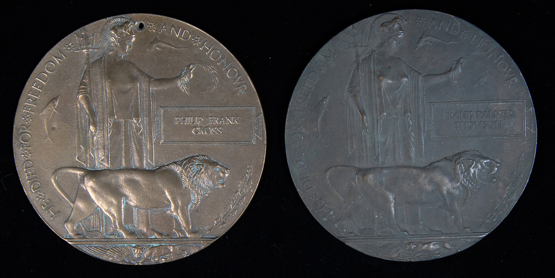 Great War Bronze Memorial Plaque (2) (Philip Frank Cross, Frank Palmer Thompson), first drilled at 12 o'clock; second with hook suspension on reverse, otherwise good very fine (2)