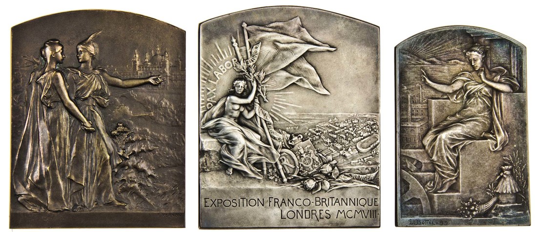 Plaquettes (6), in silvered bronze (4), Comité Français des Expositions a l'étranger 1900, by Botteé, Exposition Franco-Britannique Londres 1908, by Pillet, and Exposition Universelle Gent 1913, by Devreese, all extremely fine, all in cases of issue, and Association Belge de la Presse, 1886-1911, by Devreese, very fine, and bronze (2), Exposition Internationale de Glasgow 1901, section Française, by Vernon, extremely fine, in case of issue, and Exposition Universelle Brussel 1935, by Bonnetain, good very fine (5)