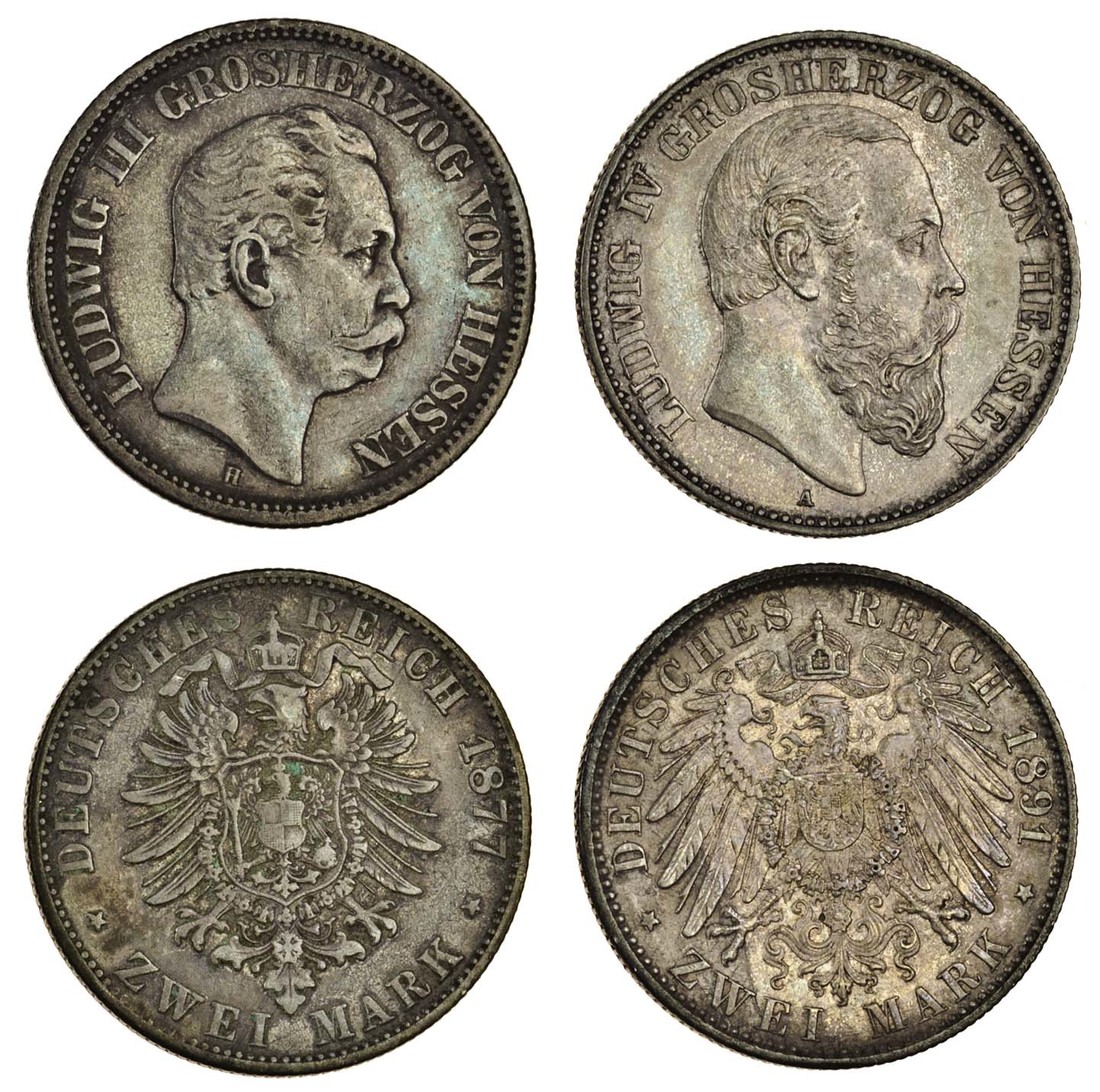 Germany, Hesse-Darmstadt, Ludwig III (1848-77), 2-Marks, 1877 H, Ludwig IV (1877-92), 2-Marks, 1891 A (KM 355, 363), about very fine and good very fine (2)