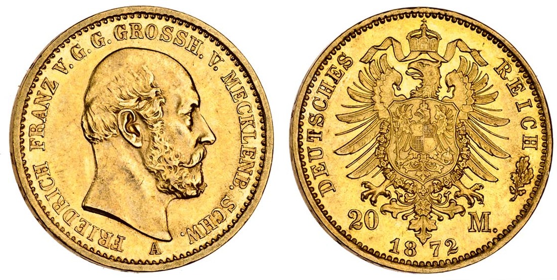 (g) Germany, Mecklenburg-Schwerin, Friedrich Franz II (1842-1883), 20-Marks 1872 A, head right, rev. German eagle (F.3800; KM 319, D&S 317; J.230), extremely fine