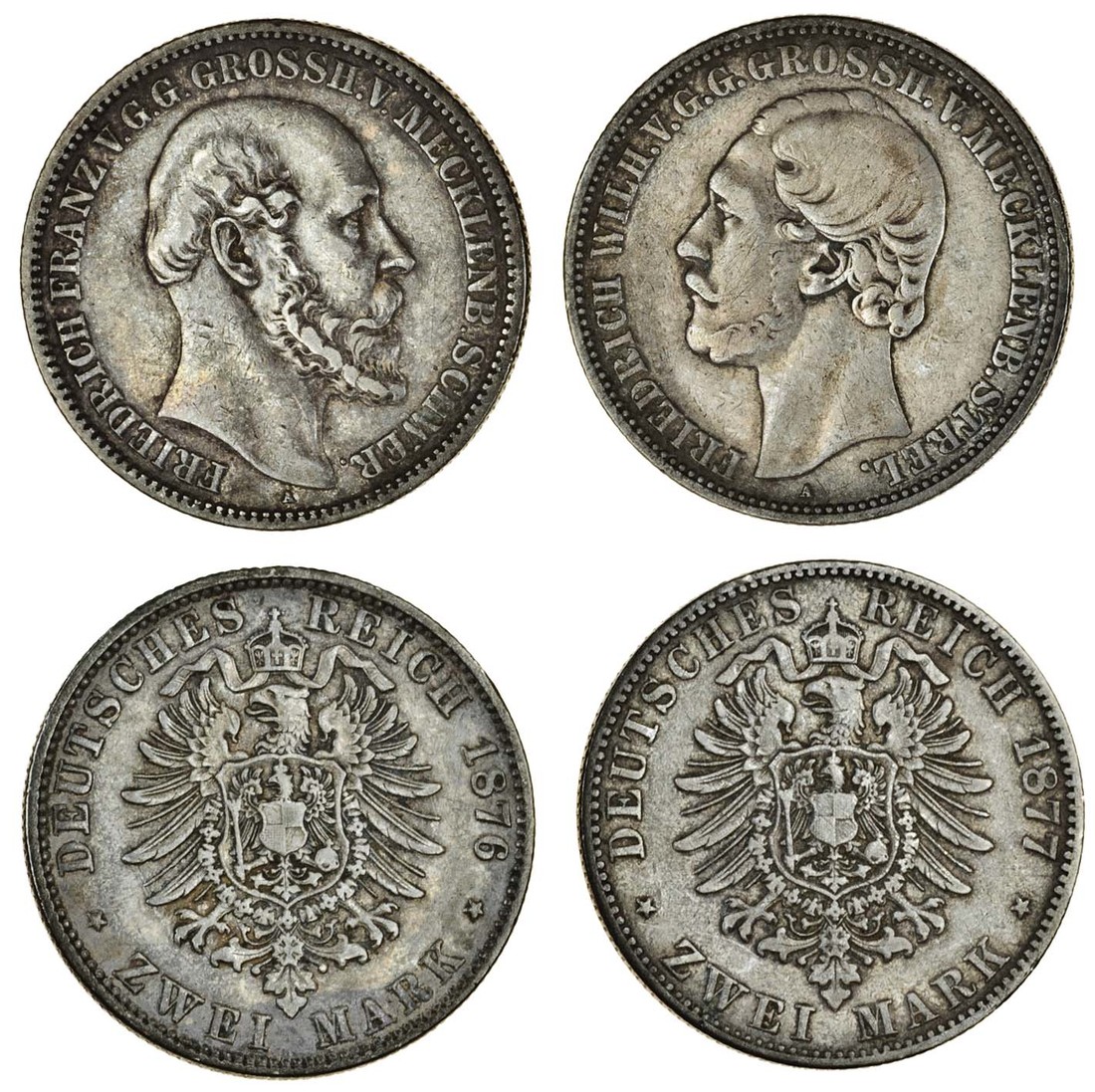 Germany, Mecklenburg-Schwerin, Friedrich Franz II (1842-83), 2-Marks, 1876 A (KM 320), Mecklenburg-Strelitz, Friedrich Wilhelm (1860-1904), 2-Marks, 1877 A (KM 108), about very fine (2)