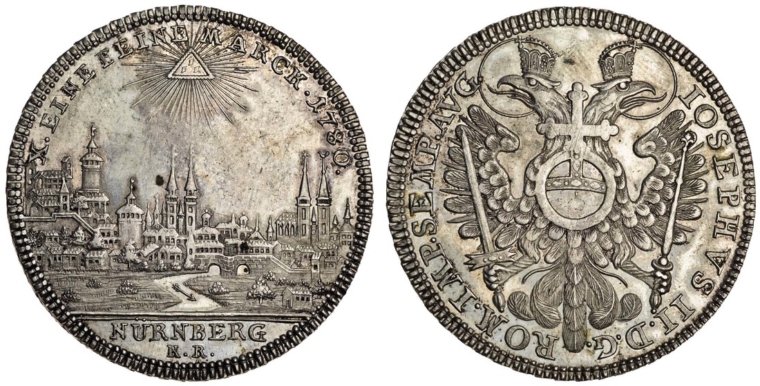 (x) Germany, Nuremberg, Taler, 1780, view of the city of Nuremberg, rev. imperial eagle holding sceptre and sword, orb on breast (Dav. 2494; KM.350), about extremely fine