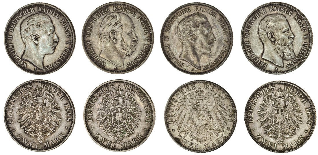 Germany, Prussia, Wilhelm I, 2-Marks, 1876 A, Friedrich III, 2-Marks, 1888 A, Wilhem II, 2-Marks (2), 1888 A, 1891 A (KM 506, 510, 511, 522), very fine to extremely fine, the third coin scarce (4)