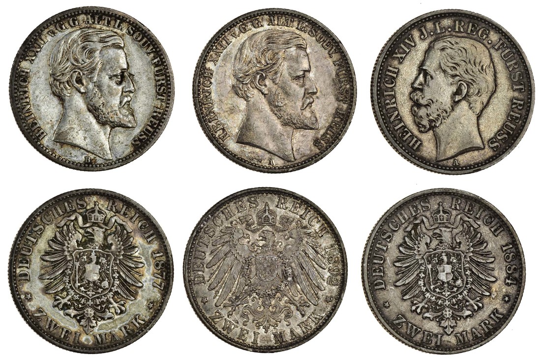 Germany, Reuss-Obergreiz, Heinrich XXII (1859-1902), 2-Marks, 1877 B, 1892 A (KM 126, 127), very fine and about extremely fine, Reuss-Schleiz, Heinrich XIV (1867 - 1913), 2-Marks, 1884 A (KM 82), about very fine (3)
