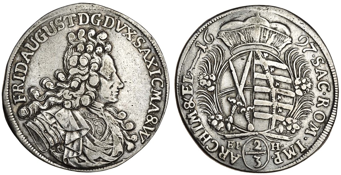 (x) Germany, Saxony, Friedrich August I (1694-1733), 2/3-Taler, 1697, EPH, cuirassed and draped bust right, rev. crowned arms within palm wreath (Dav.818; KM.655), hairlines, good fine