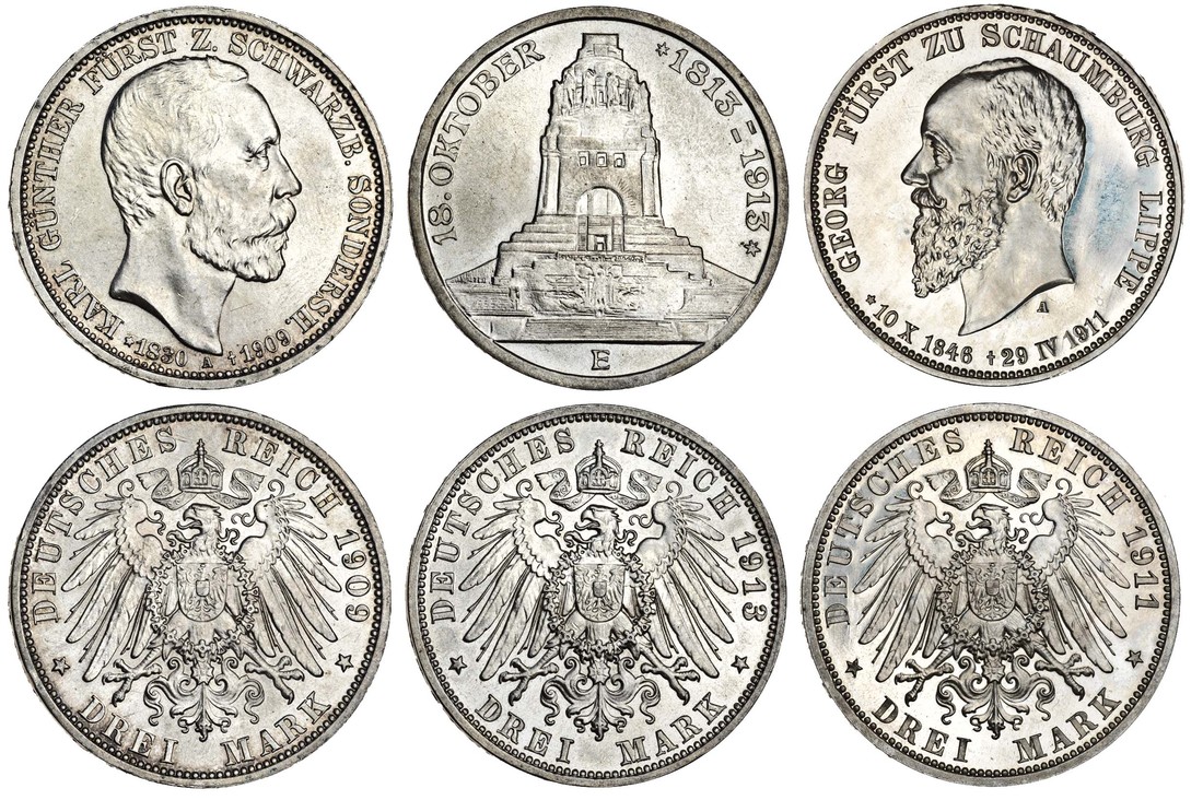 (x) Germany, Saxony, Friedrich August III (1904-18), 3-Marks, 1913E, monument, rev. crowned eagle (KM.1275), extremely fine, Schaumburg-Lippe, Albrecht Georg (1893-1911), proof 3-Marks, 1911A, on his death, head left, rev. crowned eagle (J.166; KM.55), the polished surfaces a little clouded, extremely fine; Schwarzburg-Sonderhausen, Karl Gunther (1880-1909), 3-Marks, 1909A, on his death, head right, rev. crowned eagle (J.170; KM.154), about extremely fine (3)