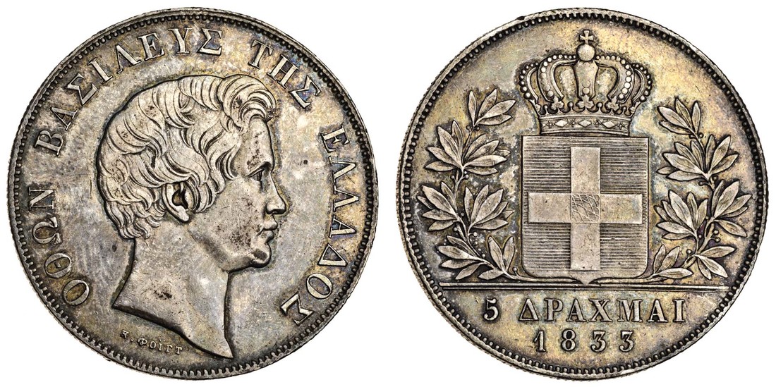 (x) Greece, Otho (1832-62), 5-Drachmai, 1833, head right, crowned shield, within wreath, value and date in exergue (Dav.115; Divo 10a; KM.20), toned, some marks on obverse, extremely fine