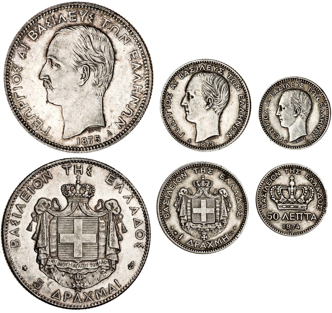Greece, George (1863-1913), 5-Drachmai, 1875, head left, rev. crowned shield (Dav.117; Divo 50a; KM 46), extremely fine, with Drachma, 1873 and 50-Lepta, 1874, very fine (3)