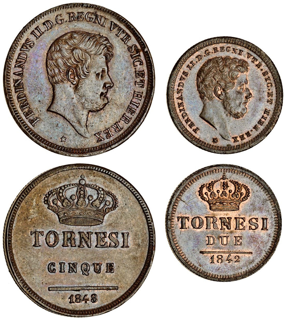 Italy, Kingdom of Naples, Ferdinando II (1830-59), copper 5-Tornesi, 1848, 2-Tornesi, 1842, head right, rev. crown over value (KM 360, 327), first about extremely fine, the second better and with lustre (2)