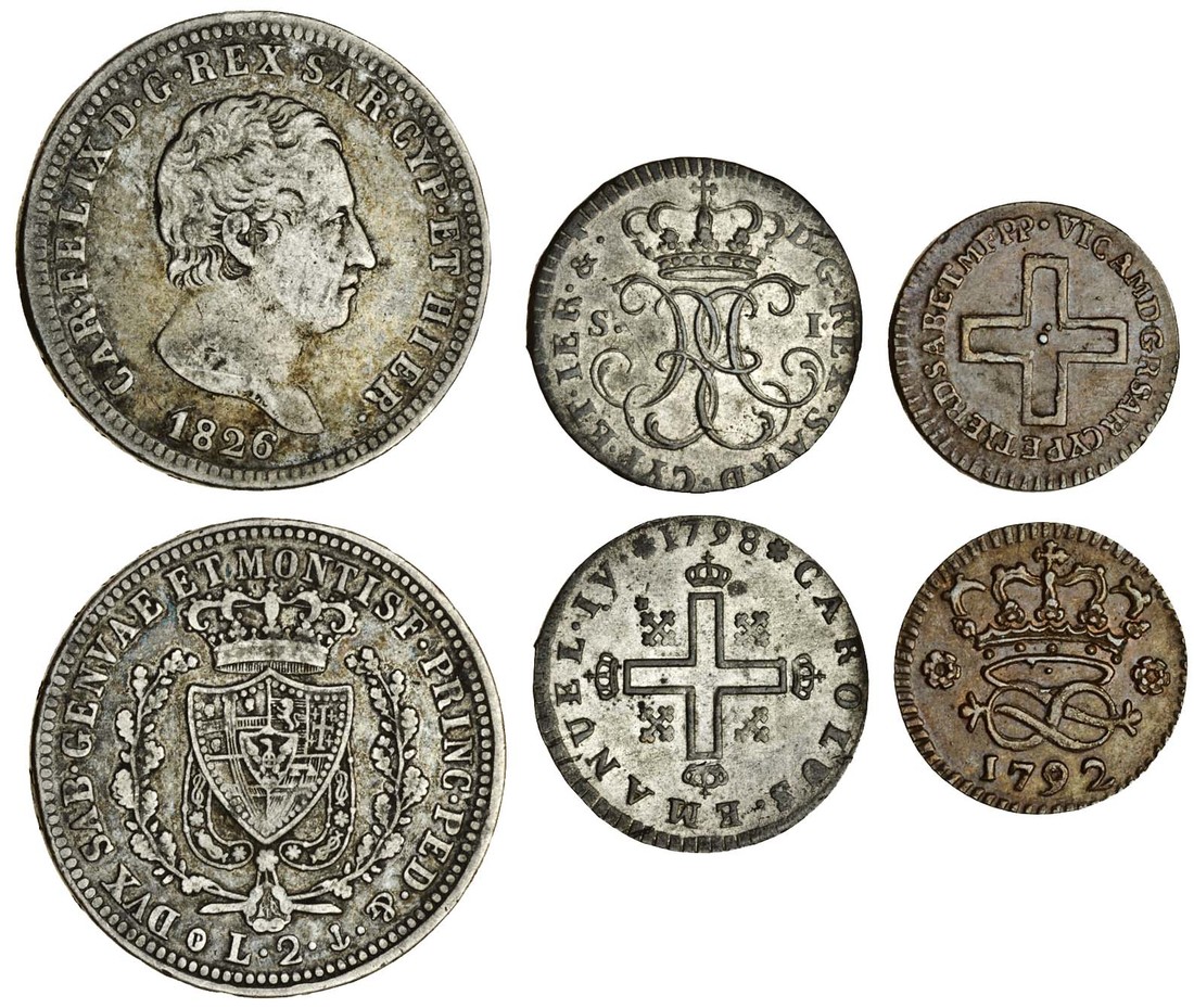 Italy, Sardinia, Carlo Emanuele IV (1796-1802), billon Soldo, 1798 (C.80), and copper 2-Denari (C.50), good very fine, Carlo Felice (1821-31), 2-Lira, 1826, head right, rev. crowned shield (KM 122.2), very fine (3)