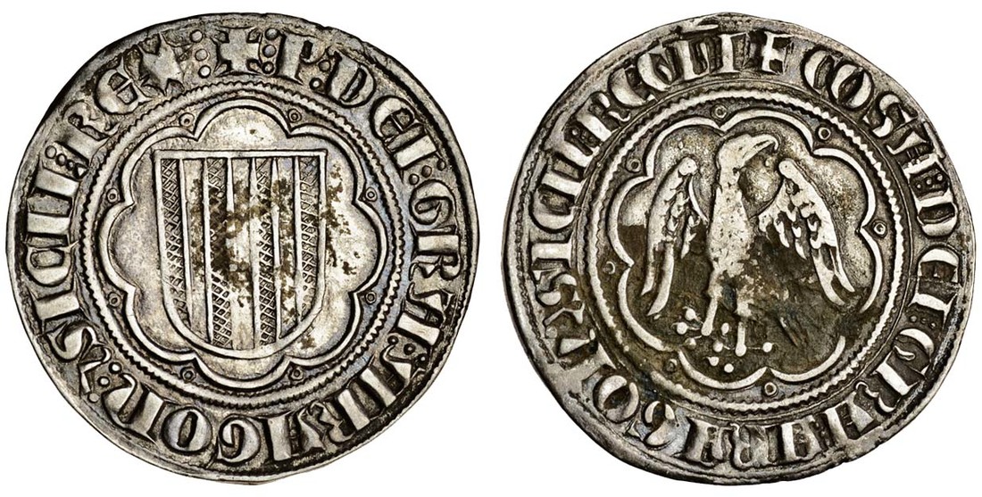 Italy, Sicily, Pietro and Costanza (1282-85), Pierreale, 3.18g, Messina, p dei gra aragon & sicil rex, shield in tressure of eight arcs, pellets in angles, rev. cosa dei gra aragon & sicil regia, eagle with head turned to right, in tressure of eight arcs, pellets in angles (MIR 172; Spahr 18), encrustation around eagle, very fine, the only variety listed with the queen's name abbreviated to cosa, rare