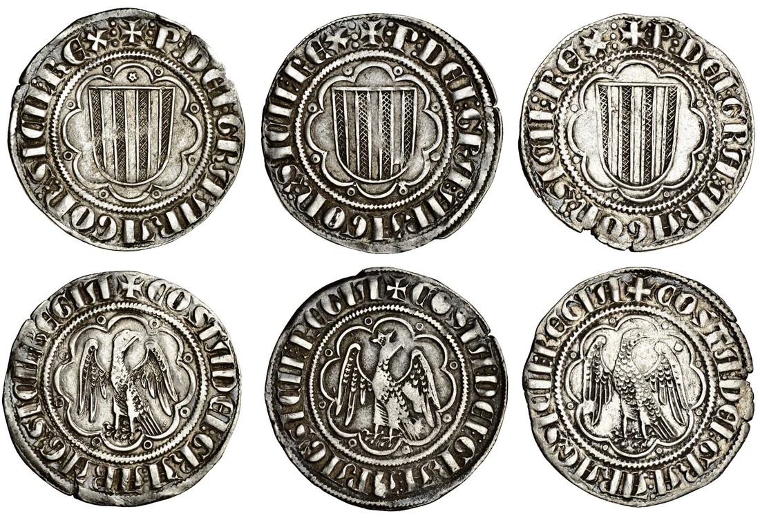 Italy, Sicily, Pietro and Costanza (1282-85), Pierreales (3), of Messina, shield in tressure of eight arcs, pellets in angles, rev. eagle with head turned to right, in tressure of eight arcs, pellets in angles, three different varieties, uncrowned eagle with pellet to right (MIR 172; Spahr 11), uncrowned eagle without pellet, rosette above shield (MIR 172; Spahr 16 var), and crowned eagle (Mir 173; Spahr 24), very fine (3)