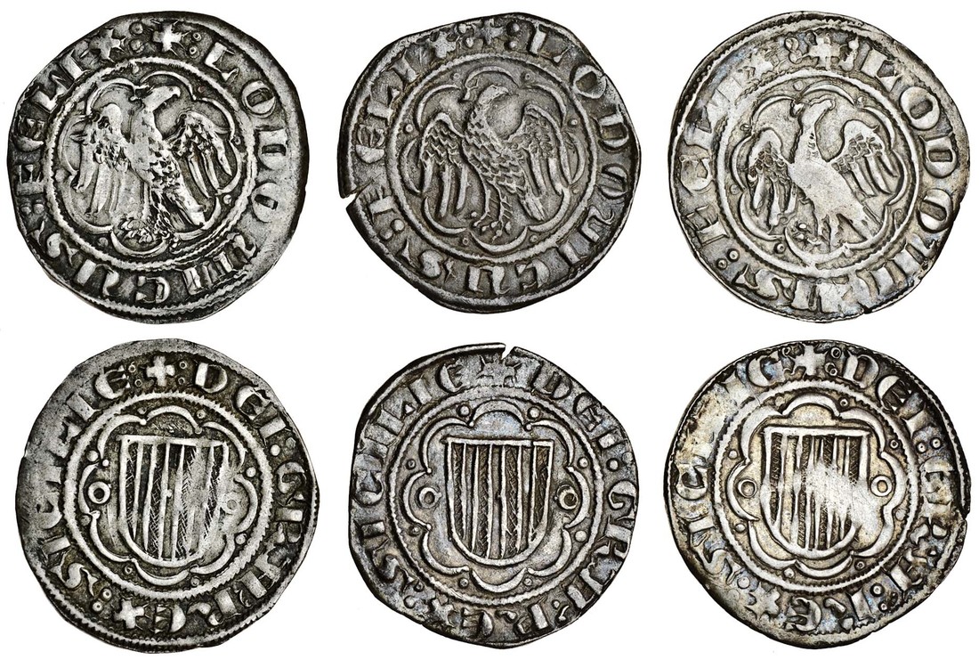 Italy, Sicily, Ludovico d'Aragona (1342-55), Pierreales (3), crowned eagle with head turned to right, in tressure of eight arcs, pellets in angles, rev. shield with circles at sides, in tressure of arcs, pellets in angles (MIR 190; Spahr 4ff), about very fine (3)