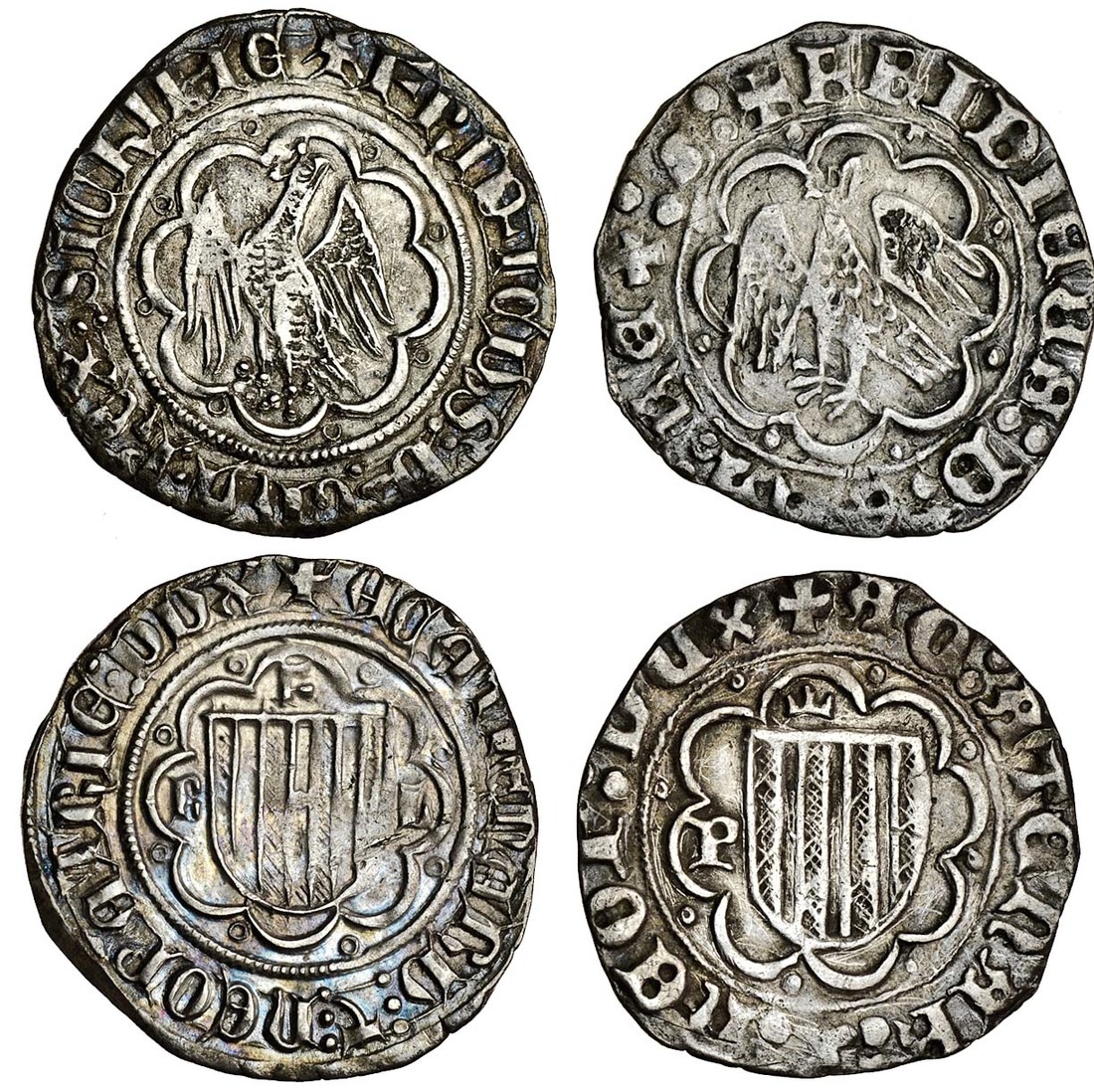 Italy, Sicily, Federico il Semplice (1355-77), Pierreales (2), crowned eagle with head turned to right, in tressure of eight arcs, rev. crowned shield, p to left (MIR 194/22; Spahr 124), and another with r-f-l to left, above, and to right of shield (MIR 194/46; Spahr 179) very fine and better (2)