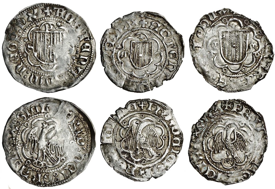 Italy, Sicily, Federico IV, il Semplice (1355-77), Mezzo-Pierreales (3), eagle, rev. shield with s-p-s (these letters - segni di distinzione - listed on a Pierreale in Spahr 144, and MIR 194/38, but not listed on a Mezzo-Pierreale), areas of flatness but very fine, and two with m-m (Spahr 214; MIR 201/1), edges slightly ragged and one with edge split, otherwise very fine (3)