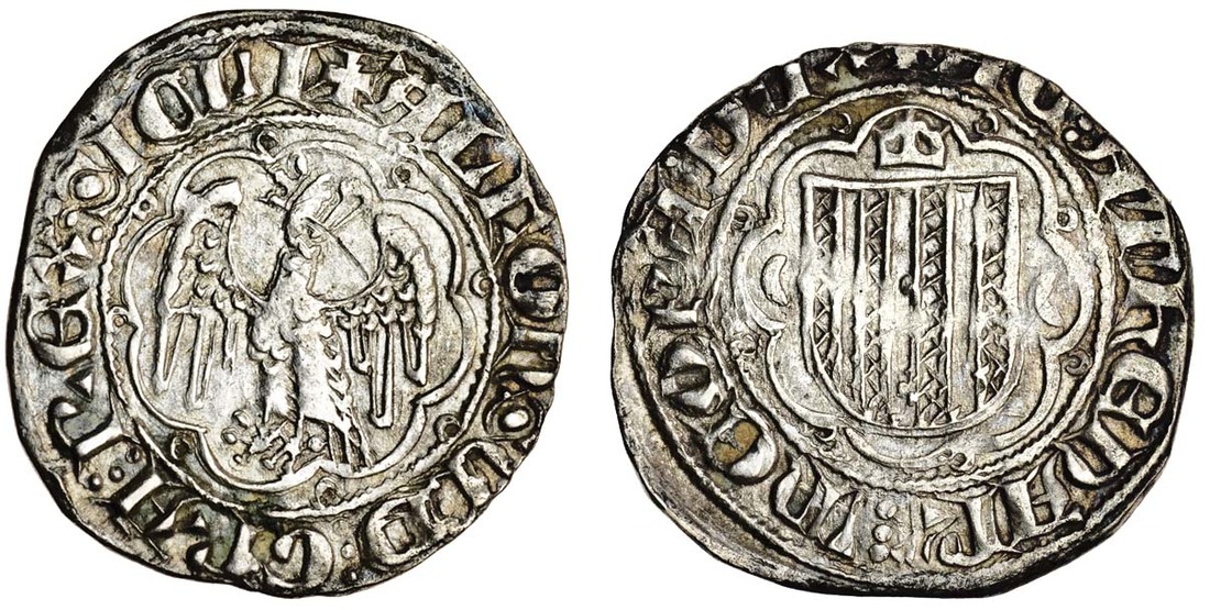 Italy, Sicily, Alfonso d'Aragona (1416-58), Pierreale, 3.17g, crowned eagle with head turned to right, in tressure of eight arcs, pellets in angles, rev. crowned shield, ( - ( at sides, in tressure of eight arcs, pellets in angles (MIR 225/1: Spahr 1/11), small scratch on eagle, very fine, rare