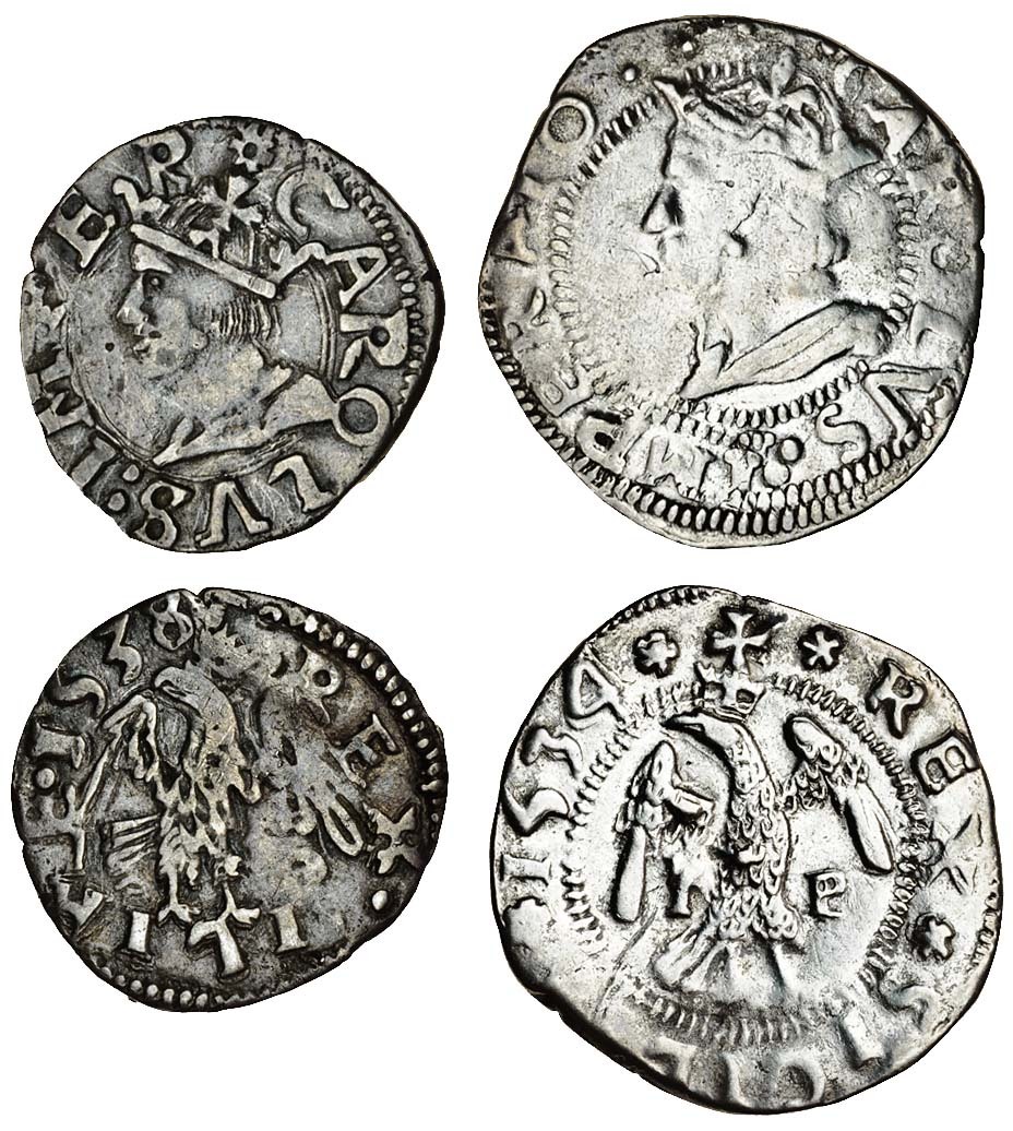 Italy, Sicily, Carlo V (1516-56), Tari, 2.77g, 1534, crowned bearded bust left, rev. eagle dividing i-p (MIR 277/4), and Mezzo-Tari, 1.38g, 1538 i-p (MIR 281/7), fine (2)