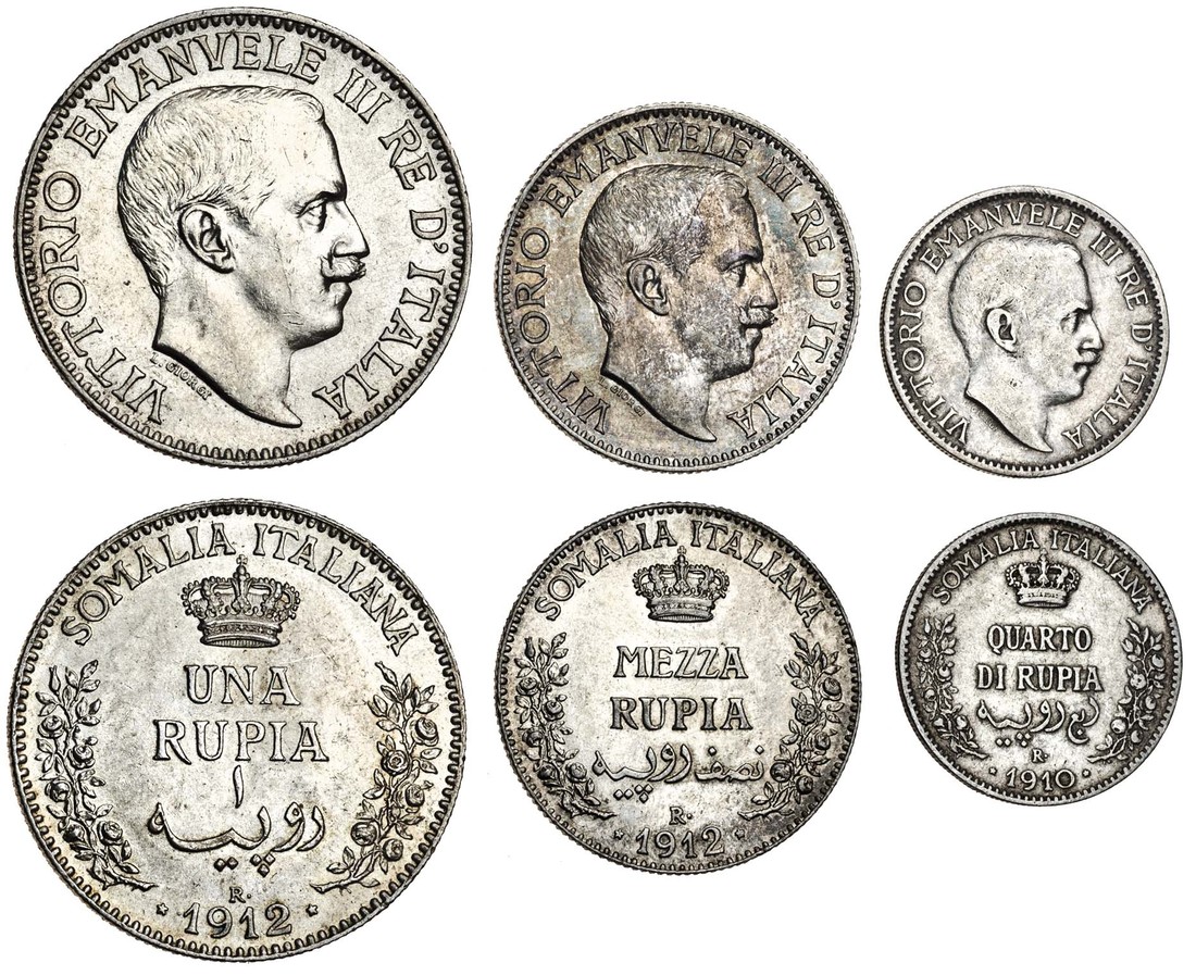 (x) Italian Somaliland, Vittorio Emanuele III (1900-46), Rupia, 1912 R, head right, rev. date and value (KM.6; Pag. 959), extremely fine, Half-Rupia, 1912 R, head right, rev. date and value (KM.5; Pag. 967), toned, hairlines, extremely fine, Quarter-Rupia, 1910 R, head right, rev. date and value (KM.4; Pag. 971), hairlines, very fine (3)