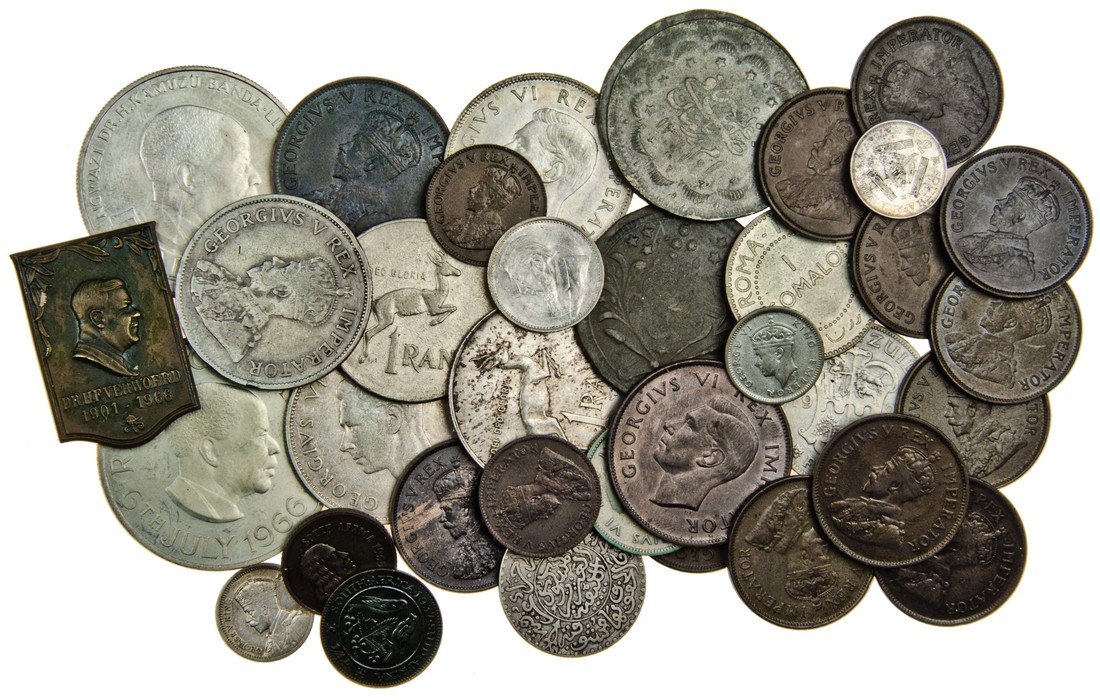 (x) Malawi, proof Crown, 1966, 10-Kwacha, 1974, Morocco, 1/4 Rial, 1321, Somalia, Somalo, 1950, South Africa, 2 1/2-Shillings (3), 1933, 1944, 1946, Florin, 1925, Shilling, 1946, Sixpence, 1897, Threepence, 1945/3, Pennies (2), 1923, 1939, Halfpennies (11), 1924 (4), 1929 (2), 1930, 1933 (2), 1934, 1939, Farthings (3), 1923 (2), 1937, Rand (2), 1967 Afrikaans legend, 1977, Cent, 1965 English legend, with a bronze plaquette, commemorating Verwoerd 1901-1966, Prime Minister of South Africa, 1958-1966, Southern Rhodesia, Threepence (2), 1936, 1945, Sudan, 20-Piastres (2), AH1311, AH1312/12, generally fine to good very fine (lot)