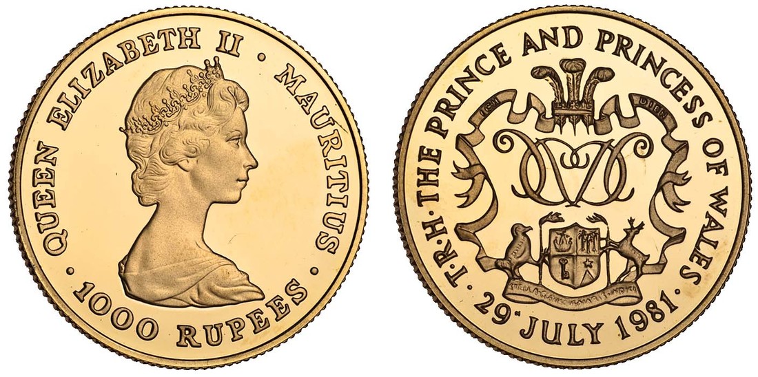 (g) Mauritius, proof 1000-Rupees, 1981, wedding of Prince Charles and Lady Diana, crowned bust right, rev. arms and monogram (KM.47), in original box of issue, no certificate, as struck