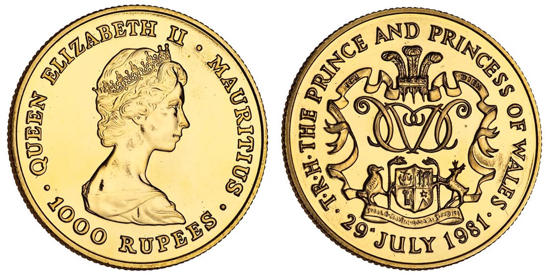 (g) Mauritius, 1000-Rupees, 1981, wedding of Prince Charles and Lady Diana, crowned bust right, rev. arms and monogram (KM.47), in original box of issue, no certificate, as struck