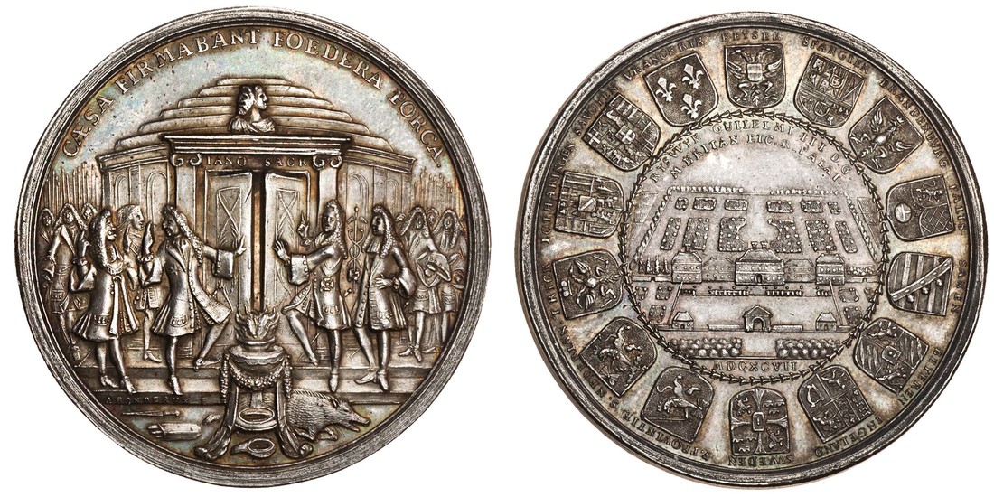 (x) Peace of Ryswick, silver medal, 1697, by R. Arondeaux, the emperor Leopold I, Louis XIV of France, William III of Nassau, Carl XII of Sweden before the temple of Janus, a burning altar in front, caesa firmabant foedera porca., rev. view of the palace and the gardens of Ryswick surrounded by arms of the countries involved, 45.99g, 49 mm, (MI ii 453), toned, extremely fine