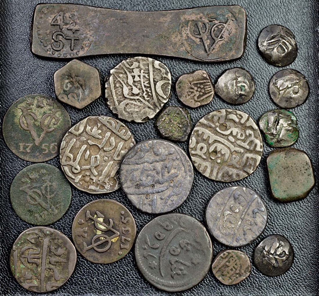 Sri Lanka / Ceylon, Dutch East India Company (VOC), modern copy of an AE 4¾ Stuivers (Bonk Bar), Colombo, AE Duits (3), 1735, 1747, 1756, India, Negapatnam, AE dump Duits (2), French Pondichery AE Duit, miscellaneous Coins AR (5), AE (4), Java, Majopahit Kingdom (1293-1520), AR Units (5), Nagari character 'Ma', about fine to fine (21)