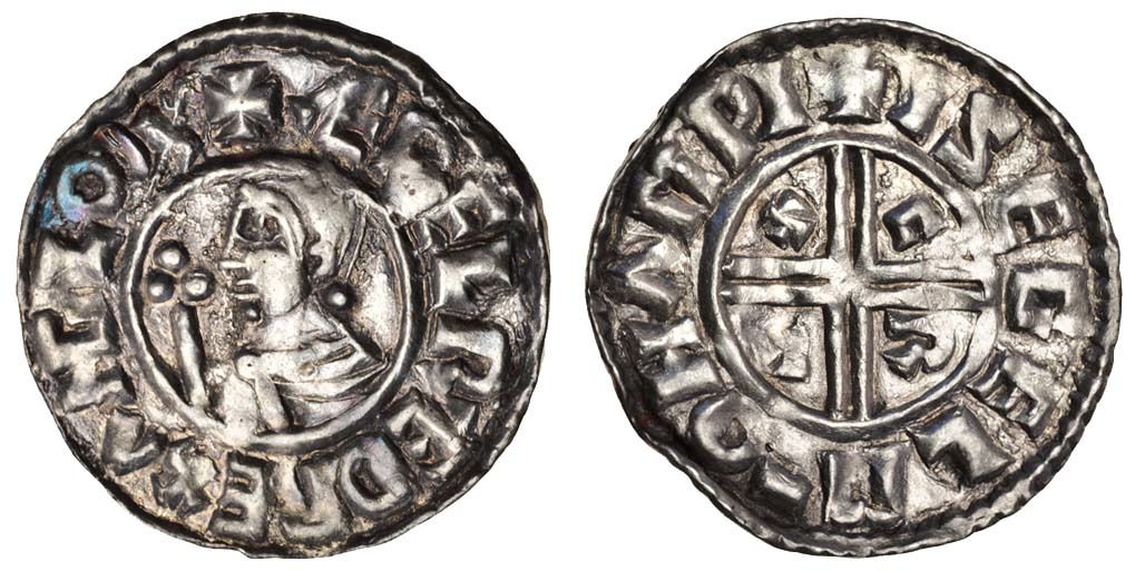 Aethelred II (978-1016), Penny, 1.65g, Crux type, Southampton, Isegel, draped bust left, sceptre before, rev. +isegel m¯o hamþi, voided short cross, a letter of crvx in angles (N.770; S.1148), obverse die slightly rusty, mostly well struck, very fine, Southampton one of the rarer provincial mints