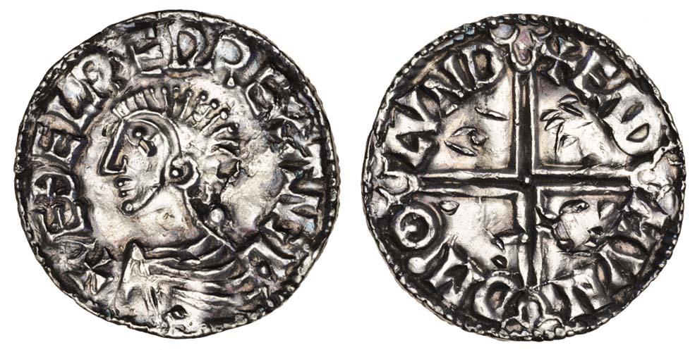 Aethelred II (978-1016), Penny, 1.38g, long cross type, London, Eadmund, bare headed bust left, rev, +eadmvnd m·o lvnd, voided long cross each arm terminating in three crescents (N.774; S.1151), dispersed pecks, nearly very fine