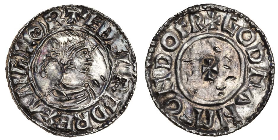 Aethelred II (978-1016), Penny, 1.31g, last small cross type, Dover, Godman, diademed bust right, rev. +godman m¯on dofr, cross pattée within inner circle (N.777; S.1154A), multiple pecks, the obverse double struck in areas, good very fine, a scarce piece with bust right and a presentable coin
