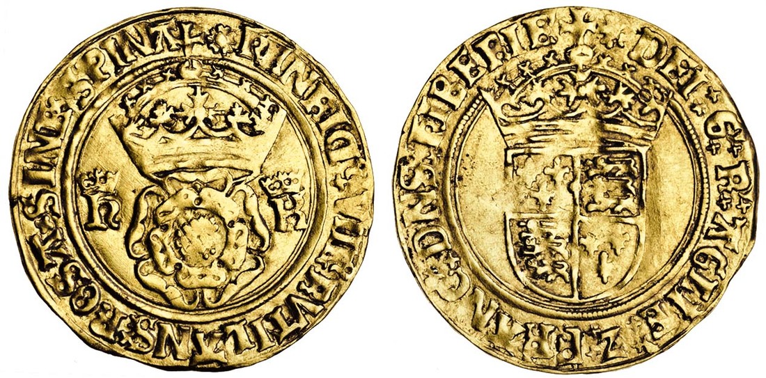 Henry VIII (1509-47), second coinage 1526-44, Crown of the Double Rose, 3.78g, m.m. rose, henric viii rvtilans rosa sine spina, crowned double rose dividing crowned h-K, rev. dei g r aglie z franc dns hiberie crowned shield (N.1788; S.2273; cf. Schneider 579-582 but variety hiberie), light scrape on reverse, very fine, a scarce variety
