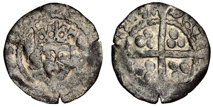 Ireland, Edward IV (1461-83), light 'cross and pellets' coinage, 1470-c.78, Penny, 0.44g, Trim, crowned bust facing, rev. [vil] la* det [rim] rosette? after la, long cross with quatrefoil in centre (Burns T1 var - type 1; S.6383 var), fine for issue but a particularly good sized flan for the penny, this variety with rosette? in the reverse legend potentially unlisted