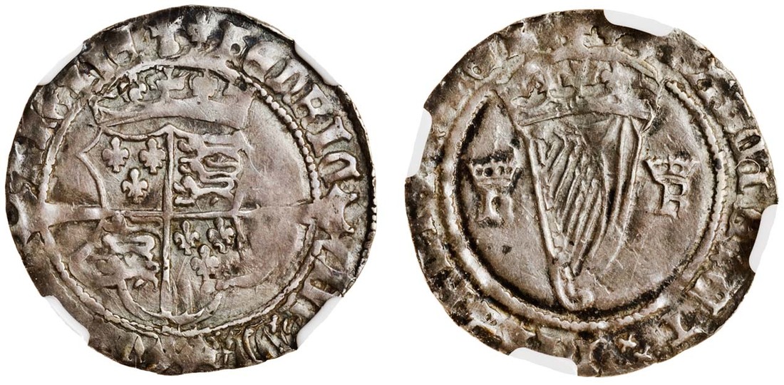 (x) Henry VIII (1509-47), fifth harp coinage, 1544-46, Groat, uncertain weight, m.m. lis, crowned shield over long cross fourchée, rev. crowned harp dividing crowned h and r, legends ends rex s (S.6483), obverse off-centre, general wear, toned, nearly very fine, slabbed in NGC holder and graded XF40