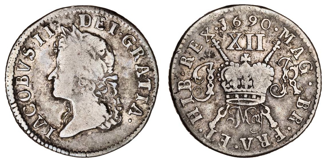 (x) Ireland, James II, 'gunmoney' Shilling, May 1690, struck in silver, laureate bust left, rev. date and value above crown, May below (S.6582 DDD), only fine but rare in silver