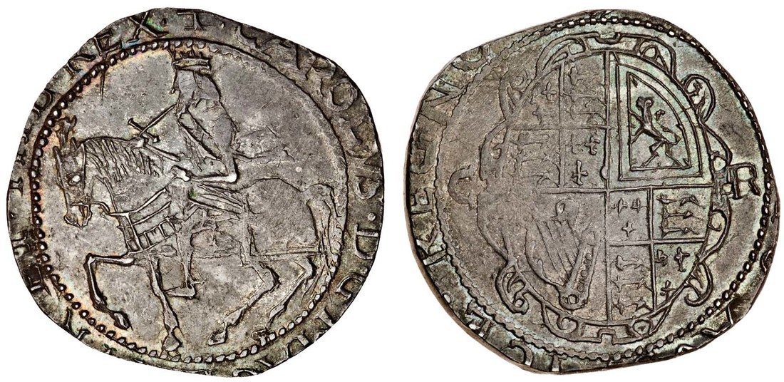 (x) Ireland, The Great Rebellion, issues of the Confederate Catholics, 'Blacksmith money', a copy of a London Halfcrown, 15.19g, m.m. cross, king on horseback left, rev. oval shield dividing c-r (D&F 335; S.6557), extremely fine for this issue and very rare thus