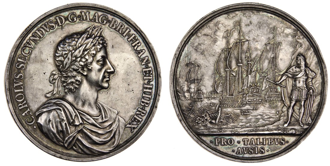 Charles II, Naval Reward, 1665, silver medal by Roettier, 90.81g, laureate and draped bust right, rev. the king as a Roman general stands on the seashore watching a naval engagement (Eimer 230; MI.503/139; MH.1919, 52; van Loon ii, 504), obverse fields cleaned and with scattered small marks, about extremely fine