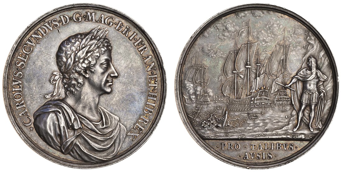 Charles II, Naval Reward, 1665, silver medal by Roettier, 93.26g, laureate and draped bust right, rev. the king as a Roman general stands on the seashore watching a naval engagement (Eimer 230; MI.503/139; MH.1919, 52; van Loon ii, 504), small marks in field behind bust, about extremely fine, attractive tone