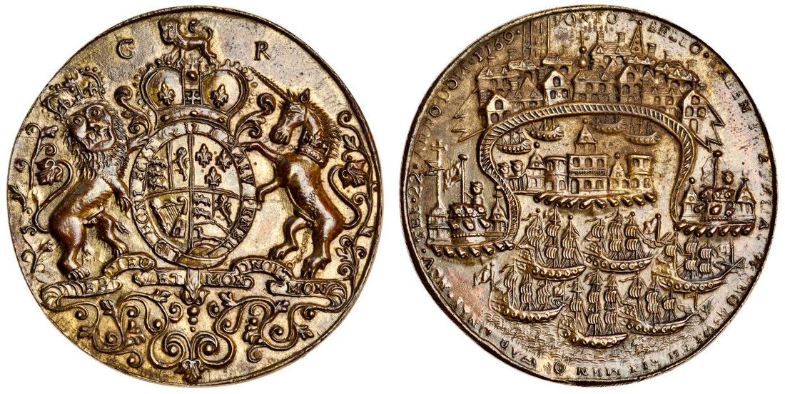 (x) George II (1727-60), Capture of Portobello 1739, bronze medal, Royal Arms with supporters, g-r above, rev. porto bello taken by admiral vernon with six men of war only nov the 22 anno 1739, six ships entering Porto Bello harbour (Adams-Chao PB2; cf. Betts 270; MI II, 539/126), extremely fine and attractive, very rare thus