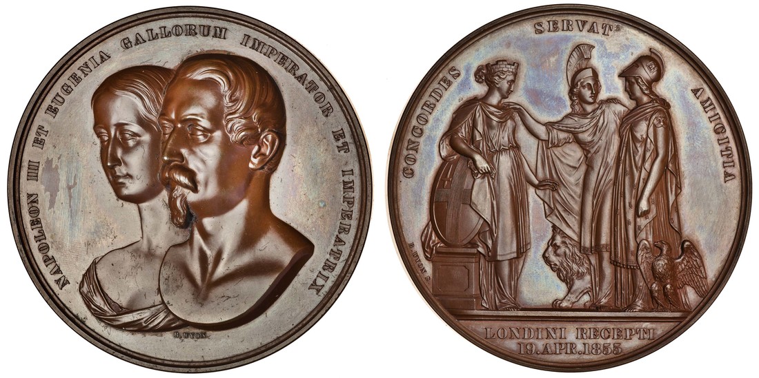 Victoria, Visit of the Emperor and Empress of France 1855, bronze medal by B Wyon, busts three-quarters left, rev. Britannia presenting Gallia to Londinia, 76mm. (BHM 2561; E.1496; W.7), extremely fine, scarce, only 350 struck, in scuffed case of issue