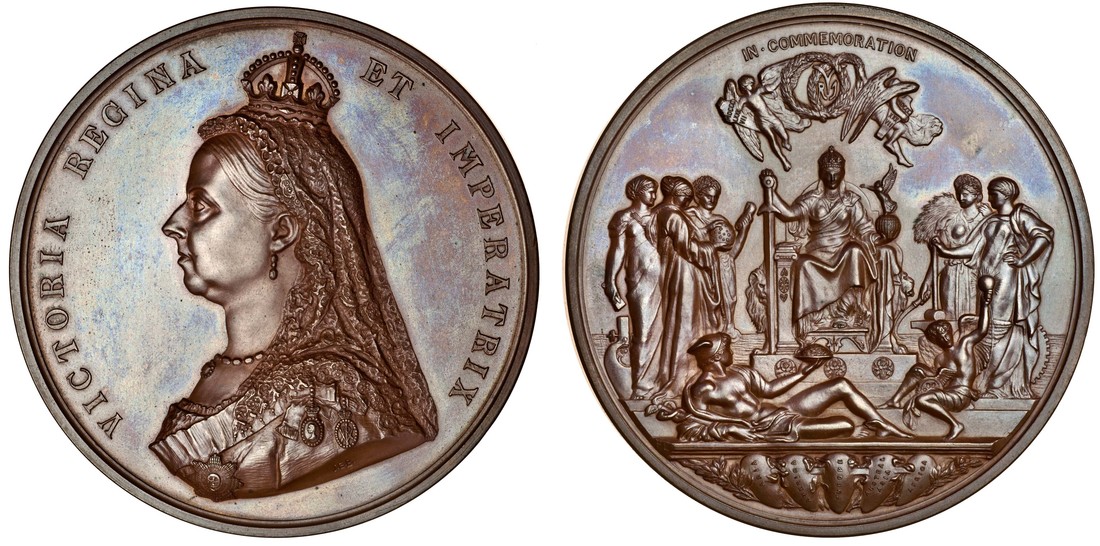 Victoria, Jubilee 1887, large bronze medal by JE Boehm and F Leighton, crowned bust left, rev. 'Empire' enthroned surrounded by allegorical figures, 77mm. (BHM.3219; E.1733), extremely fine, in case of issue