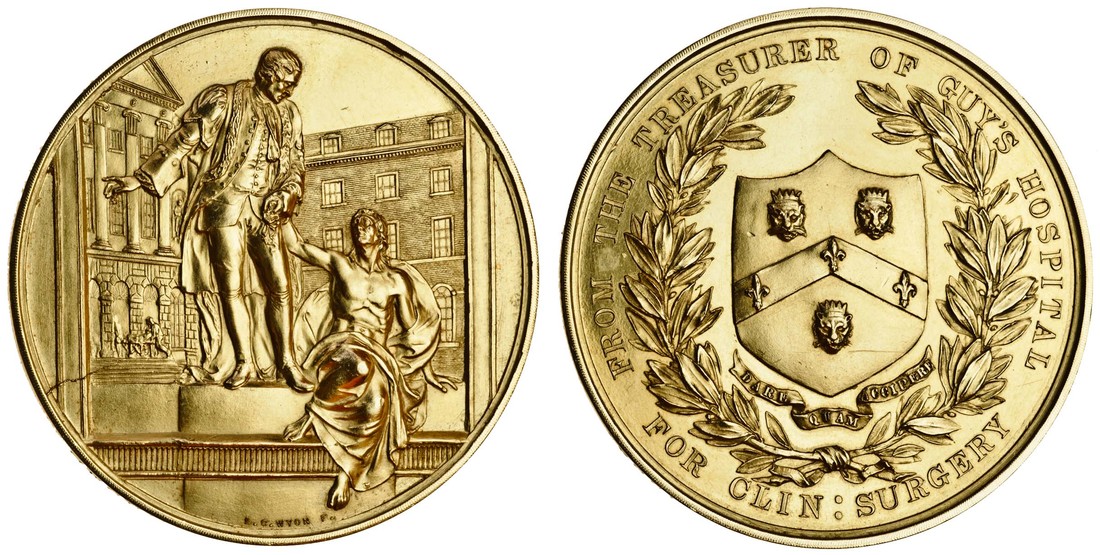 (x) Edward VII, Guy’s Hospital, gold medal for clinical surgery by L. C. Wyon, 49mm, 70.39g, Guy's memorial monument in Guy's Hospital Chapel, sculpted by John Bacon in 1779, rev. arms within wreath, from the treasurer of guy's hospital for clin: surgery, edge engraved, George Cockcroft, 1906. (BDM VI, 630, illustrated), in leather case, flan crack at 8 o'clock, good very fine