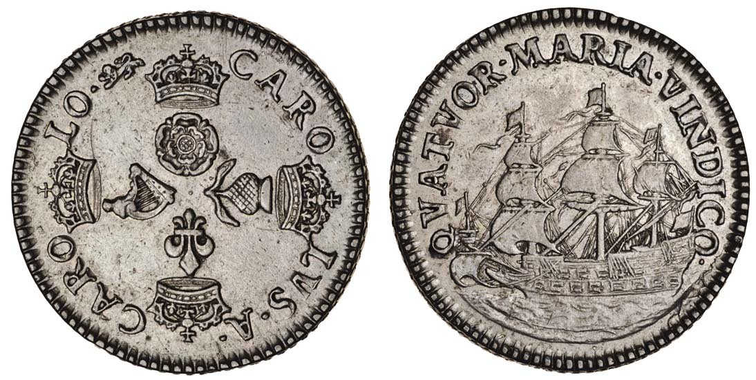 Charles II (1660-85), official pattern Farthing, 1662, caro-lvs a caro-lo, crowned rose, thistle, harp and lis, rev. qvatvor maria vindico, ship sailing to left, edge straight grain in centre (Peck 400), about extremely fine