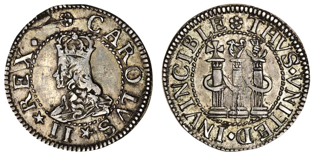Charles II (1660-85), pattern, possibly for a Farthing, by Ramage, in silver, 3.10g, undated (c.1660), crowned bust left in roped circle, bust touches circle, flower at begining of legends, carolvs ii rex, star stops, rev. three pillars entwined with cable, emblems on top of each, all within roped circle, thvs vnited invincible, diamond stops, edge plain (Peck 474), die flaw at top of obverse, weak strike at centre, good very fine, toned, very rare