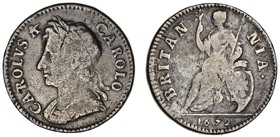 Charles II (1660-85), Farthing, 1672, carolvs a carolo without stops, laureate and cuirassed bust left, rev. Britannia seated left (Peck 520), good fine/fine, very rare,