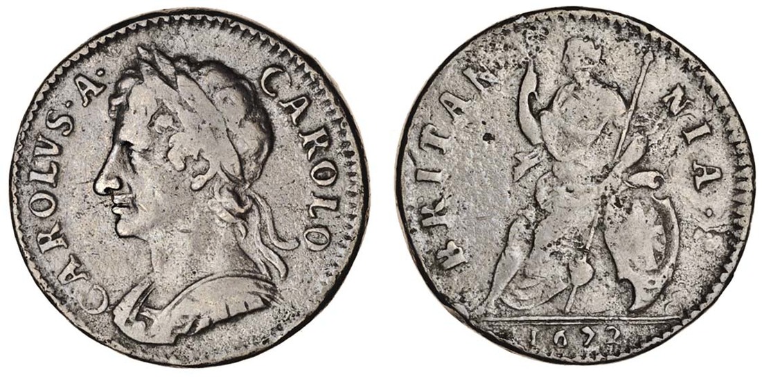 Charles II (1660-85), Farthing, 1672, carolvs a carolo with stops, laureate and cuirassed bust left, rev. Britannia seated left, with loose drapery (Peck 521), about very fine, scarce