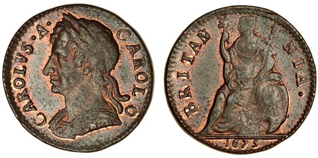 Charles II (1660-85), Farthing, 1675, carolvs a carolo, laureate and cuirassed bust left, rev. Britannia seated left (Peck 528), some weakness to hair, as usual, but retaining considerable mint brilliance, extremely fine