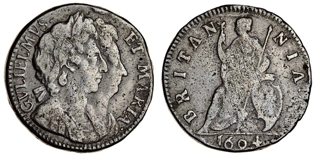 William and Mary (1688-94), Farthing, 1694, laureate and draped busts right, rev. Britannia, single exergue line, plain edge (Peck 619), good fine, rarene