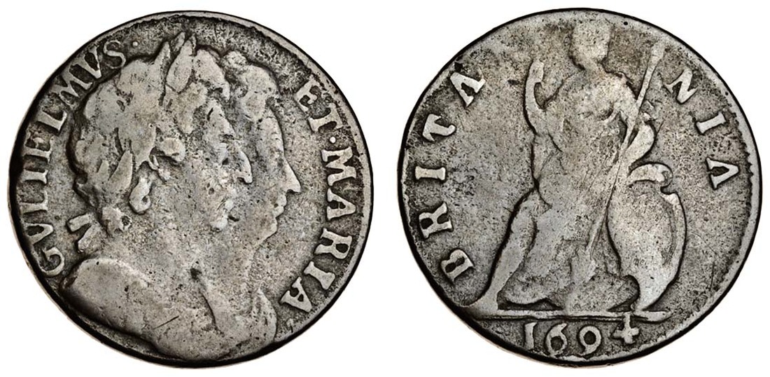 William and Mary (1688-94), Farthing, 1694, laureate and draped busts right, rev. Britannia, unbarred As in britannia, plain edge (Peck 622 - ER), fine