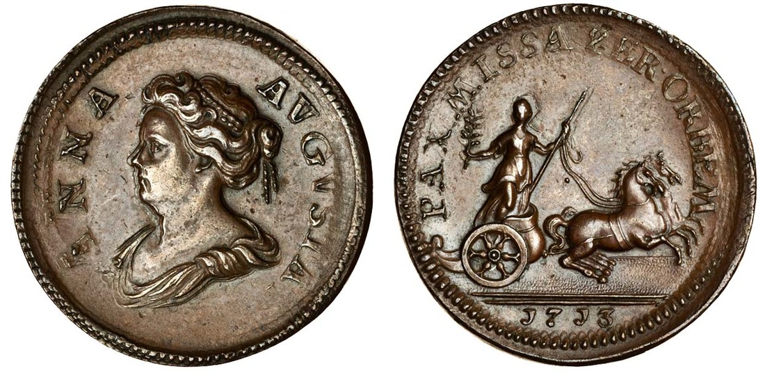 Anne (1702-14), pattern Farthing, 1713, in copper, draped bust left, anna avgvsta, rev. Peace in biga galloping right, pax missa per orbem, date in exergue, 24.8mm. diam, on a thick flan ranging from 2.1mm. - 2.5mm. (Peck 764), with the usual double-striking mentioned by Peck, rub on the highpoints, good extremely fine, very rare